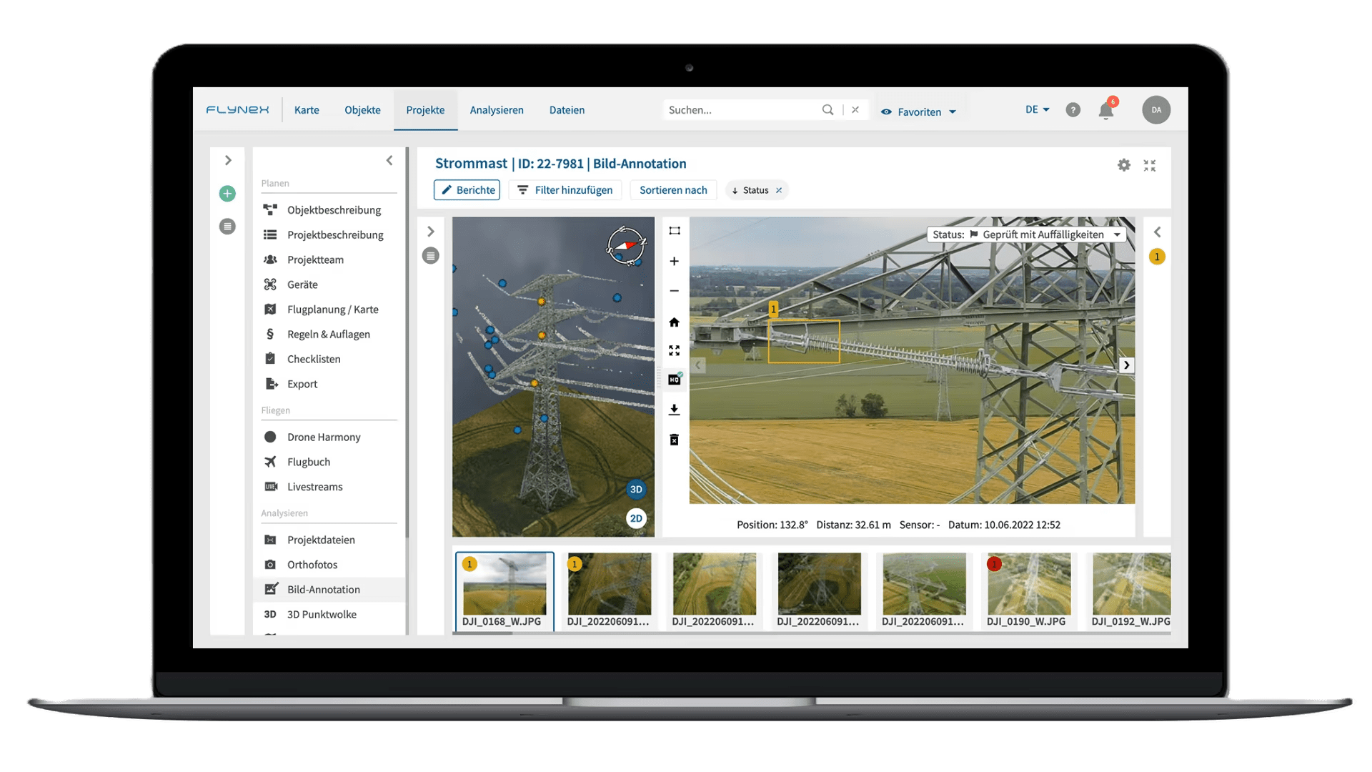 Wir wissen, wie zeitaufwendig und kostenintensiv Betrieb und Wartung dieser Anlagen sein können. Darum wollen wir Ihre Inspektionsprozesse revolutionieren und haben dafür die FlyNex Plattform entwickelt. Dank der FlyNex Plattform können Daten Ihrer Anlagen automatisiert erhoben, effizient verwaltet und intelligent ausgewertet werden.