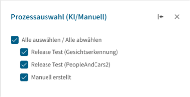– Dropdown zur Prozessauswahl mit der Möglichkeit, einzelne KI- oder manuell erstellte Prozesse gezielt ein- oder auszublenden