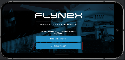 Öffnen Sie die FlyNex Connect App auf Ihrem mobilen Gerät. Unter „Mit Code anmelden“ holen Sie sich den temporär gültigen 9-stelligen Zugangscode ab.