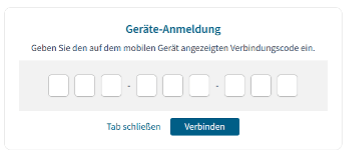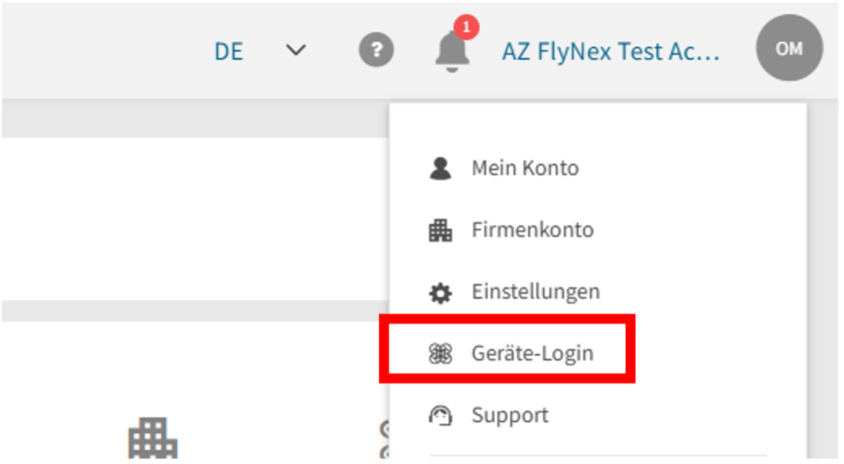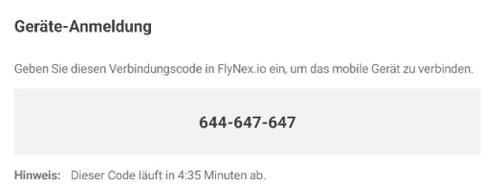 Melden Sie sich im FlyNex Web-Portal an und navigieren Sie über Ihr Profilmenü (oben rechts) zu „Geräte-Login“. Geben Sie den auf dem mobilen Gerät angezeigten Verbindungscode in die Maske „Geräte-Anmeldung“ ein und klicken Sie auf „Verbinden“.